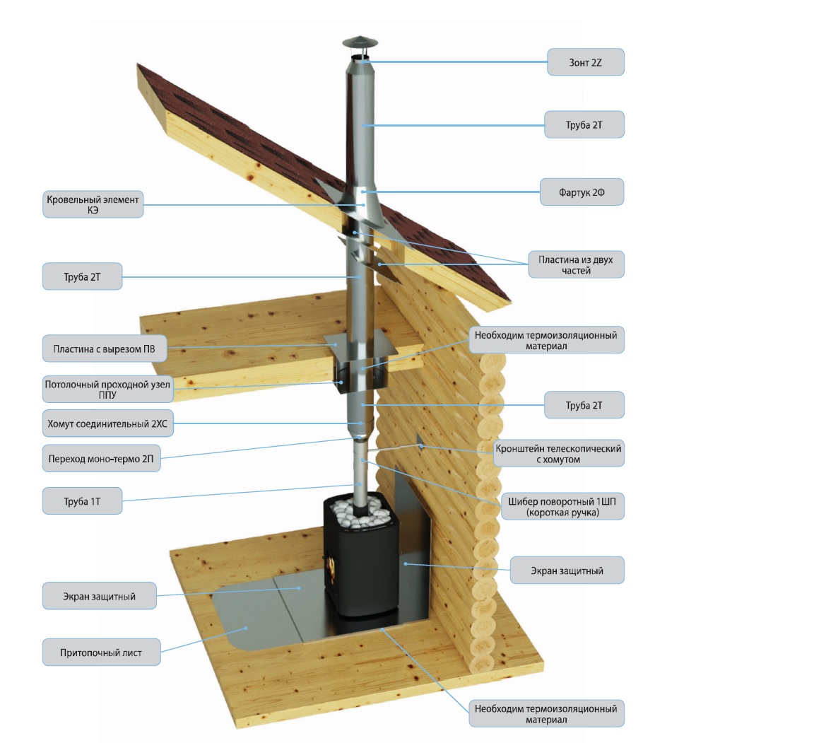 Труба-сэндвич нашего дымохода изготовлена из высококачественной нержавеющей стали толщиной 1мм. Толщина 1мм. позволяет добиться высокой конструкционной прочности изделия.